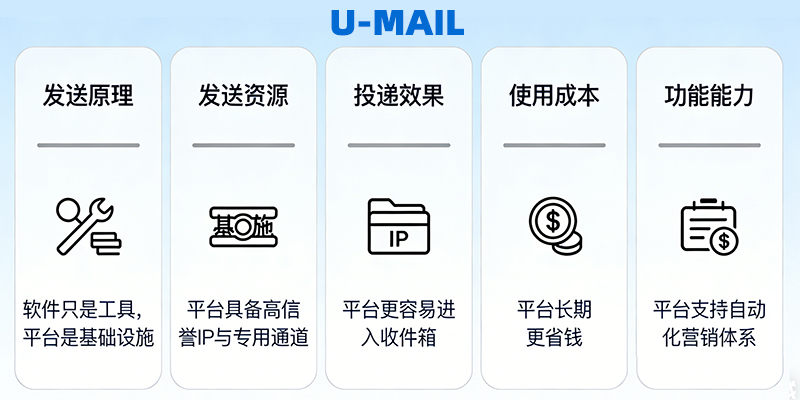 邮件群发软件无法控制发送链路、IP信誉、退信处理、队列策略等关键投递能力,而平台可以自主优化投递路径,提高送达率与稳定性。