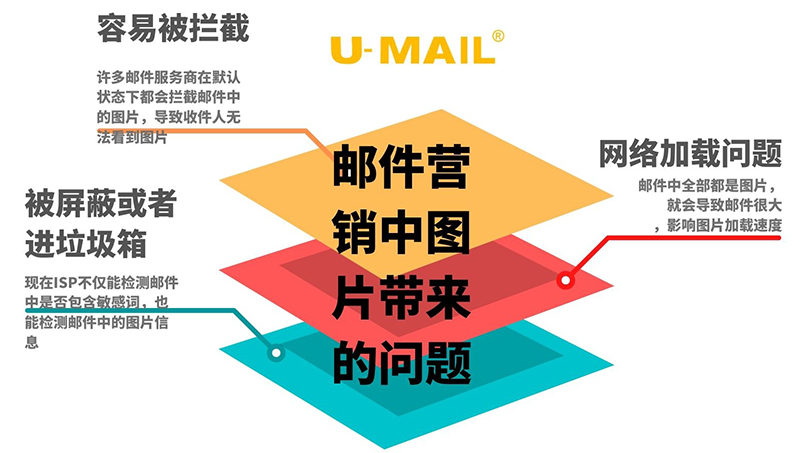 如果邮件中全部都是图片,就会导致邮件很大,并且会涉及到图片加载的问题。一般图片超过15k,在邮件里加载速度就会很慢,如果是超过50k,就有可能出现图片显示不出来的情况。 当收件人在网络很差的情况下查看邮件时,邮件中的图片就无法加载,那么收件人也无法看到整个邮件内容。